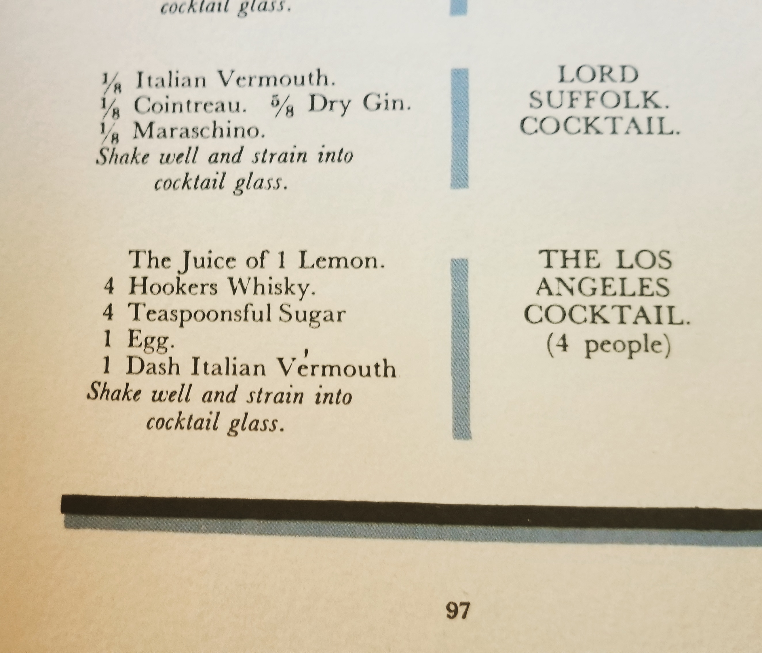 Despite being listed alphabetically in the “cocktail” section there’s nothing about this drink that ties it to the traditional “cocktail” family of drinks. It contains no bitters and has enough citrus to dilute the base spirit beyond recognition. Apart from that the drink is described as serving four people, uses blended whiskey, powdered sugar, a whole egg, and only a “splash” of vermouth. It’s just a worse version of a New York Sour. While L.A. may have once been the subpar New York City that is certainly not the case any more and I think that’s what makes this drink stick in my craw.