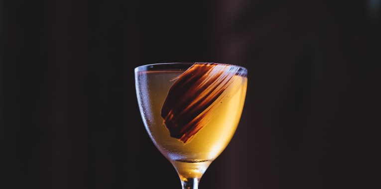 The garnish was easy. While I personally love an incredibly dry drink I know not everyone does. And the drink ingredients could read sweeter than the final product. So, to appease both types of drinkers a single brush stroke of chocolate ganache was added to the outside of the glass. This allowed the guest to choose their own adventure. If they wanted the drink slightly sweeter they could indulge in the chocolate or leave it alone. It also ads a look of elegance has an elegance that can sit just at the tip of the lips.
